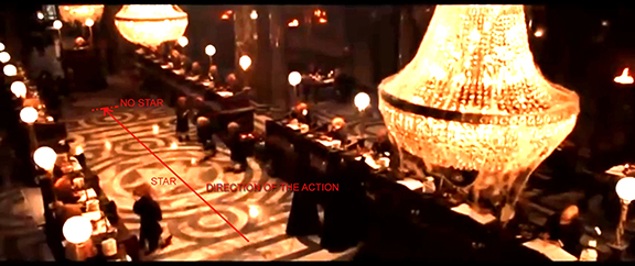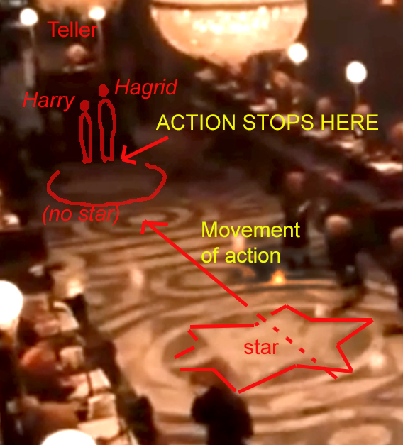 SCENE ACTION ANALISYS ![]() Notice the movement of Potter and Hagrid as they are traced through this scene (red arrow through the floor), and notice that there is only one star in the floor which is situated in the center of the room. It is a good distance from the teller. |