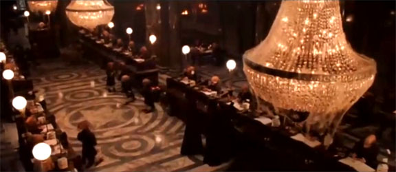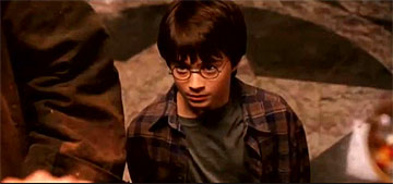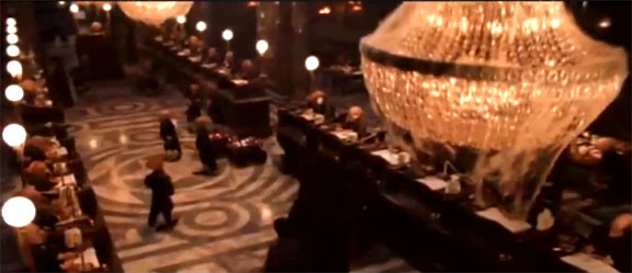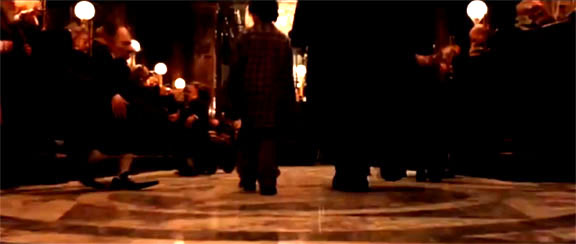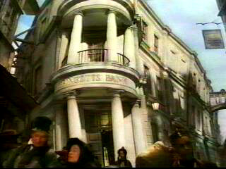 where they come to rest to speak to the teller. The question remains, if there is no star beneath the teller at the end of the room where Harry and Hagrid are standing, then why and how is Potter standing nearly on top of the star? ![]() Note how this scene is constructed from the viewpoint of the teller. The view is designed and composed with Harry surrounded by the Jewish star while speaking to the teller. It makes no sense for the continuity of the movement of the action leading up to this scene, as the action of walking through the hall to get to the teller has Harry walking over, through and then past the star. Then as Harry stops at the end of the hall where there is no star to speak to the teller. The big question is: how is he suddenly centered in the star? ... again, where there is no star. This point is significant if one considers the director might be attempting to make a visual statement connecting the Jewish star with gold. Harry's stance is such that he seems fearful as if to have his hands tied behind his back as if being interrogated like a prisoner of war. This creates a visual concept of Harry tied up, surrounded and swallowed up by the Jewish star in this dark seemingly Jewish world of demonic bankers. |
