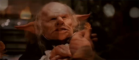 the director flashes us a full close-up of the devil-like goblin-banker, grinning